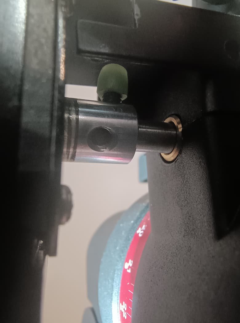 Foto: Eixo do motor com o parafuso de fixação verde em destaque.
